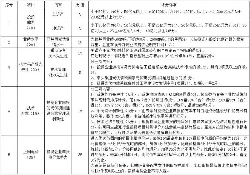通過資格準(zhǔn)入的投資企業(yè)由專家組按照國家能源局文件要求,根據(jù)評分標(biāo)準(zhǔn)表進(jìn)行客觀評分并分項(xiàng)目排序。