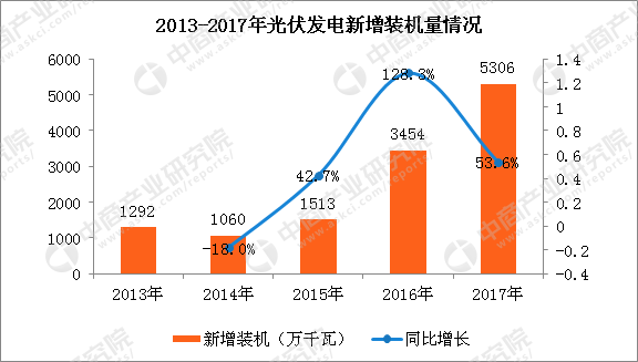 據(jù)統(tǒng)計(jì),2014-2015年我國光伏發(fā)電新增裝機(jī)量逐年穩(wěn)步上漲,特別是2016年我國光伏發(fā)電新增裝機(jī)容量3454萬千瓦,同比增長高達(dá)128.3%。初步計(jì)算,2017年光伏發(fā)電的新增裝機(jī)還是2016年的1.5倍、2015年的3.5倍、2014年的5陪和2013年的4倍,由此可見2017年光伏新增裝機(jī)出現(xiàn)了大幅快速增長。