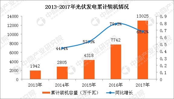 到2017年12月底,全國光伏發(fā)電裝機(jī)達(dá)到1.3億千瓦,其中,光伏電站10059萬千瓦,分布式光伏2966萬千瓦。而此前太陽能“十三五”規(guī)劃的目標(biāo)僅105GW,已經(jīng)提前并超額完成了“十三五規(guī)劃目標(biāo)”。“十三五”以來,隨著太陽電池技術(shù)進(jìn)步的快速提高,太陽電池生產(chǎn)成本和光伏發(fā)電成本快速下降,在各項(xiàng)光伏政策的支持下,我國光伏發(fā)電市場繼續(xù)保持快速發(fā)展。