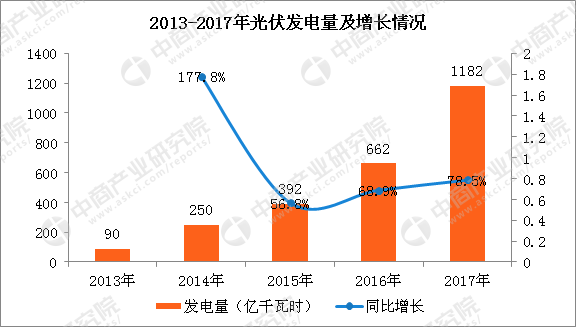從發(fā)電情況來看:2017年,全國光伏發(fā)電量1182億千瓦時(shí),同比增長78.6%,光伏發(fā)電量占全部發(fā)電量的比重由2016年的1.1%提高到1.8%。