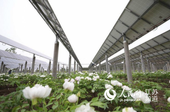 光伏板整齊排列,白牡丹搖曳生姿,幾位農(nóng)民正忙著給牡丹除草松土。“這是我們種植的油用牡丹,也是我們探索的農(nóng)光互補(bǔ)新模式?!眳f(xié)鑫新能源副總裁張耀邦指著綿延數(shù)里的牡丹花海說。