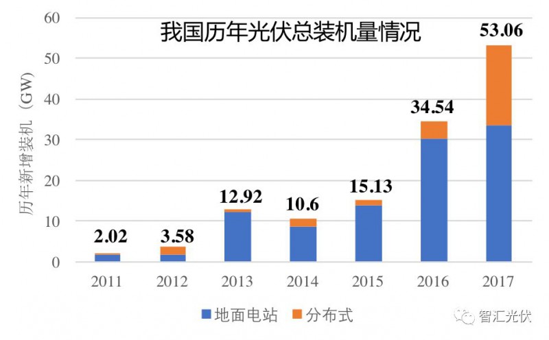 2017年,光伏新增裝機5306萬kW,首次超過火電,成為第一大新增電力裝機。