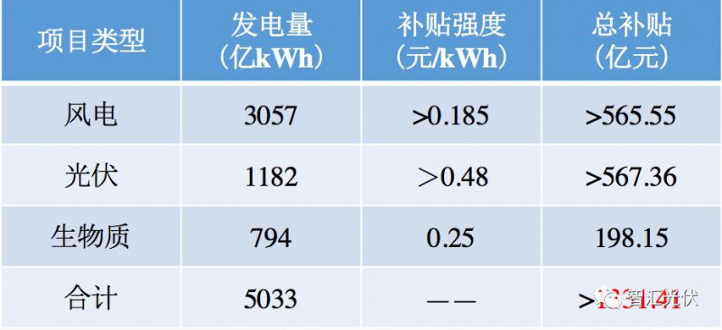 2017年風電、光伏、生物質(zhì)的發(fā)電量分別是3057億kWh、1182億kWh、794億kWh,所需的補貼累計1331.41億元以上。如下表所示。