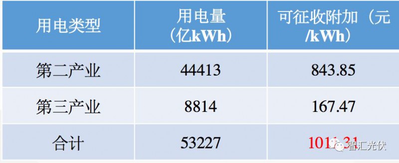 2017年,第二、第三產(chǎn)業(yè)的累計用電量為53227億kWh ,按照1.9分/kWh的標準,理論上可以征收到1011.31億元可再生能源附加補貼。