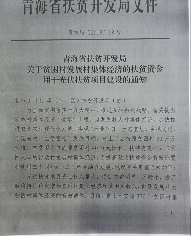 中國儲能網(wǎng)訊:近日,青海省扶貧開發(fā)局下發(fā)了《關(guān)于貧困村發(fā)展村集體經(jīng)濟(jì)的扶貧資金用于光伏扶貧項目建設(shè)的通知》,要求各地務(wù)必將青海省已經(jīng)安排370個貧困村集體經(jīng)濟(jì)扶貧資金1.85億元全部用于光伏扶貧項目建設(shè)。