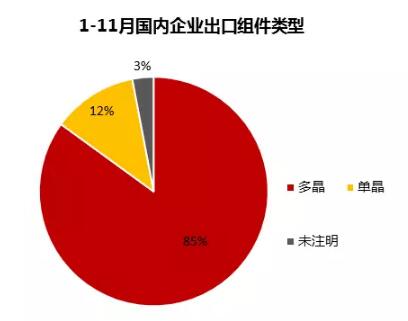 中國儲能網(wǎng)訊:根據(jù)海關(guān)出口數(shù)據(jù)統(tǒng)計,2017年1-11月中國累計出口組件約35吉瓦,其中29.8吉瓦為多晶組件,占比85%;單晶組件4.2吉瓦,占比12%;剩余3%為未注明類型的組件。