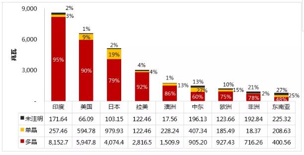 在海外第一大市場—印度,1-11月國內(nèi)企業(yè)出口的組件總量為8.58吉瓦,多晶組件達(dá)到8.15吉瓦,占比95%;單晶僅有0.25吉瓦,占比3%;在海外第二大市場-—美國和中南美洲,多晶組件也占了出口組件總量約90%的份額;在出口至日本、澳洲市場的組件中,多晶占比分別達(dá)到79%、86%,單晶占比分別為19%和13%。