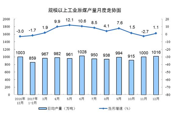 12月份,原煤產(chǎn)量3.1億噸,同比增長1.1%,增速由負(fù)轉(zhuǎn)正;日均產(chǎn)量1015.7萬噸,比11月份增加15.8萬噸。1-12月份,原煤產(chǎn)量34.5億噸,同比增長3.2%。