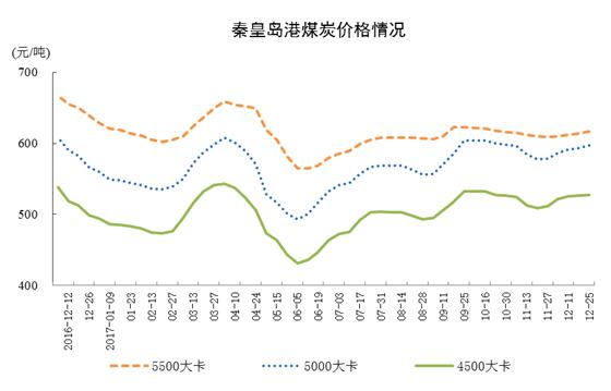 截至12月底,秦皇島5500大卡煤炭平倉價617元/噸,比11月底上漲8元/噸;5000大卡597元/噸,上漲19元/噸;4500大卡527元/噸,上漲15元/噸。