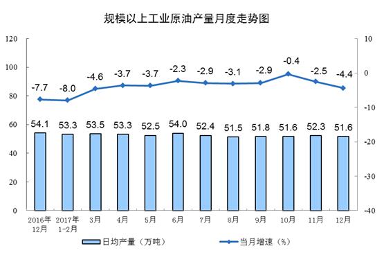 受油田后備資源接替不足、計劃性減產(chǎn)及寒潮天氣等因素影響,原油生產(chǎn)持續(xù)下降。12月份,原油產(chǎn)量1598.4萬噸,同比下降4.4%,降幅比11月份擴(kuò)大1.9個百分點;日均產(chǎn)量51.6萬噸,比11月份減少0.8萬噸。1-12月份,原油產(chǎn)量1.9億噸,同比下降4.0%。