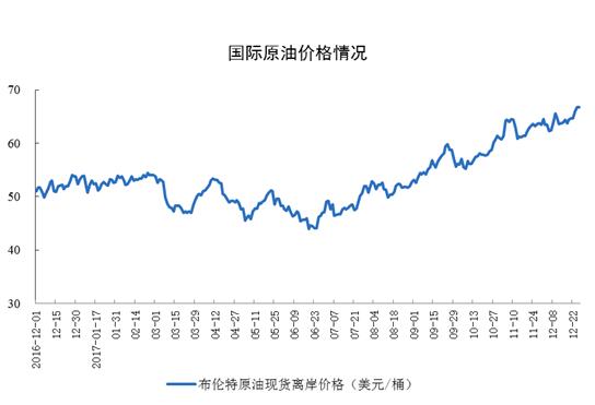 原油價格持續(xù)回升。12月份,布倫特原油現(xiàn)貨離岸價格整體保持上漲趨勢。截至12月29日,價格為66.7美元/桶,比11月底上漲3.2美元/桶。