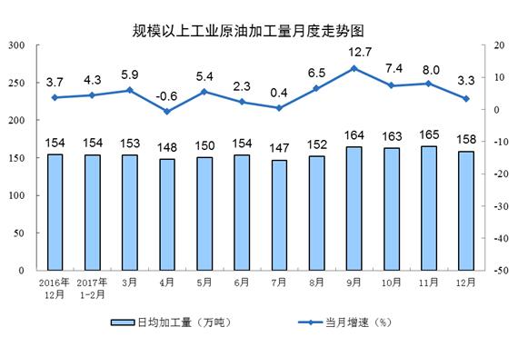 受企業(yè)停產(chǎn)檢修等因素影響,原油加工量增速放緩。12月份,原油加工量同比增長3.3%,增速比11月份回落4.7個百分點;日均加工量158.4萬噸,比11月份減少6.3萬噸。主要成品油生產(chǎn)增速均有回落,其中汽油、煤油和柴油產(chǎn)量增速分別比11月份回落7.8、1.3和2.9個百分點。1-12月份,原油加工量5.7億噸,同比增長5.0%。