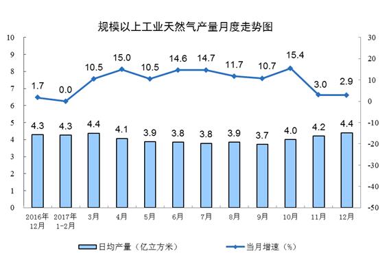 隨著煤炭減量替代政策的實施、“煤改氣”工程的推進(jìn),國內(nèi)天然氣消費需求量持續(xù)攀高,12月份,天然氣產(chǎn)量136.1億立方米,月產(chǎn)量為歷史新高,同比增長2.9%,增速與11月份基本持平;日均生產(chǎn)4.4億立方米,比11月份增加0.2億立方米。1-12月份,天然氣產(chǎn)量1474.2億立方米,同比增長8.5%。