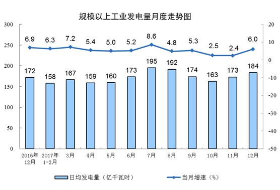 12月份,全國平均氣溫較上年同期偏低1.9℃,受寒潮天氣及煤改電政策等的影響,用電需求增加,電力生產(chǎn)加快,發(fā)電量同比增長6.0%,增速比11月份加快3.6個百分點,日均發(fā)電量183.8億千瓦時,比11月份增加10.6億千瓦時。