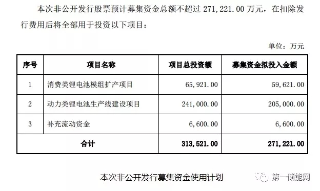 欣旺達此前發(fā)布的股票發(fā)行方案顯示,公司擬非公開發(fā)行股票不超過258,000,000股,募集資金不超過271,221.00萬元,用于“消費類鋰電池模組擴產(chǎn)項目”、“動力類鋰電池生產(chǎn)線建設(shè)項目”和“補充流動資金”。上述項目共需資金271,221.00萬元,公司截至2017年上半年末的貨幣資金余額為183,989.26萬元,流動資產(chǎn)與流動負債分別為661,763.62萬元、566,890.09萬元,公司雖有一定的貨幣資金,但公司營運資金非常有限,流動資產(chǎn)大多由流動負債提供,缺乏長期資金支持,且公司需要保證正常生產(chǎn)經(jīng)營的流動性需要,即使考慮每年主營業(yè)務(wù)創(chuàng)造的現(xiàn)金流入,亦無法滿足公司現(xiàn)階段的新增資本支出的資金需求,因此公司擬考慮外部股權(quán)融資。