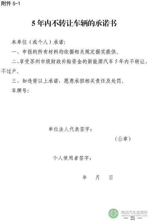(一)享受市級財(cái)政補(bǔ)貼資金的新能源汽車營運(yùn)原則上限于蘇州市范圍內(nèi),且5年內(nèi)不得轉(zhuǎn)讓、過戶(購買者因企業(yè)破產(chǎn)、依法整合等原因確需轉(zhuǎn)讓的,需將信息報(bào)送至省新能源汽車推廣應(yīng)用協(xié)調(diào)小組辦公室、市新能源汽車推廣應(yīng)用工作領(lǐng)導(dǎo)小組辦公室,且只能在蘇州市區(qū)<除吳江區(qū)外>范圍內(nèi)轉(zhuǎn)讓、過戶);享受市級財(cái)政補(bǔ)貼資金的公共服務(wù)領(lǐng)域充電設(shè)施原則上不得移除,因規(guī)劃調(diào)整等原因確需移除的需報(bào)將信息報(bào)送至市新能源汽車推廣應(yīng)用工作領(lǐng)導(dǎo)小組辦公室,具體按《江蘇省公共領(lǐng)域新能源汽車充電設(shè)施建設(shè)、運(yùn)營管理辦法(試行)》執(zhí)行。