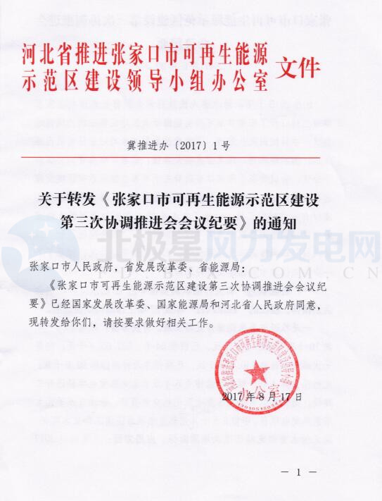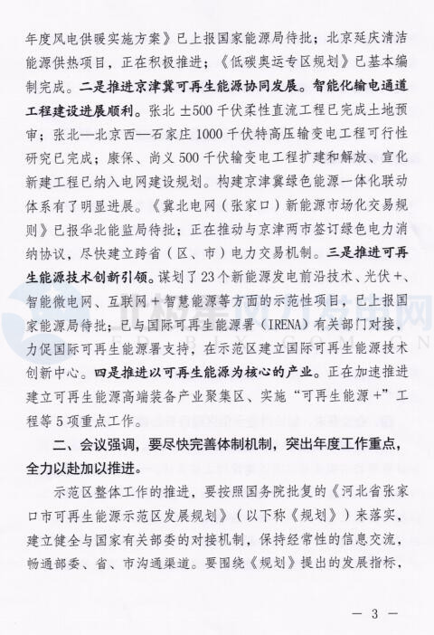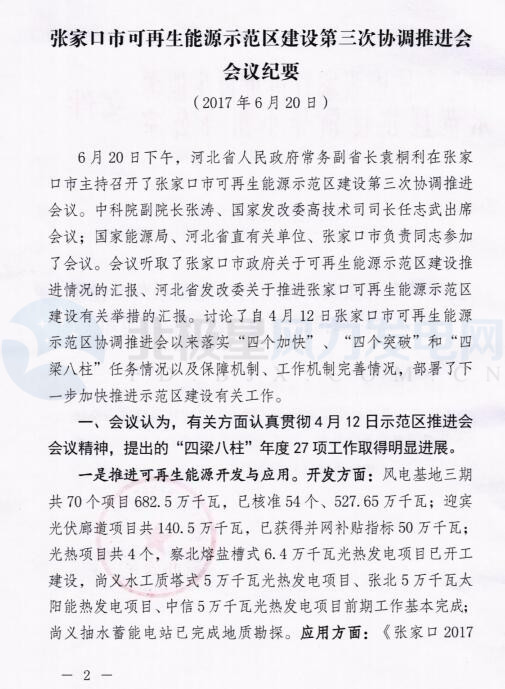 中國儲能網(wǎng)訊:河北發(fā)改委近日轉發(fā)《張家口市可再生能源示范區(qū)建設第三次協(xié)調推進會會議紀要》,會議紀要指出,在開發(fā)方面:風電基地三期共70個項目682.5萬千瓦,已核準54個、527.65萬千瓦;應用方面:《張家口2017年度風電供暖實施方案》已上報國家能源局待批;北京延慶清潔能源供熱項目,正在積極推進。以下為會議紀要全文: