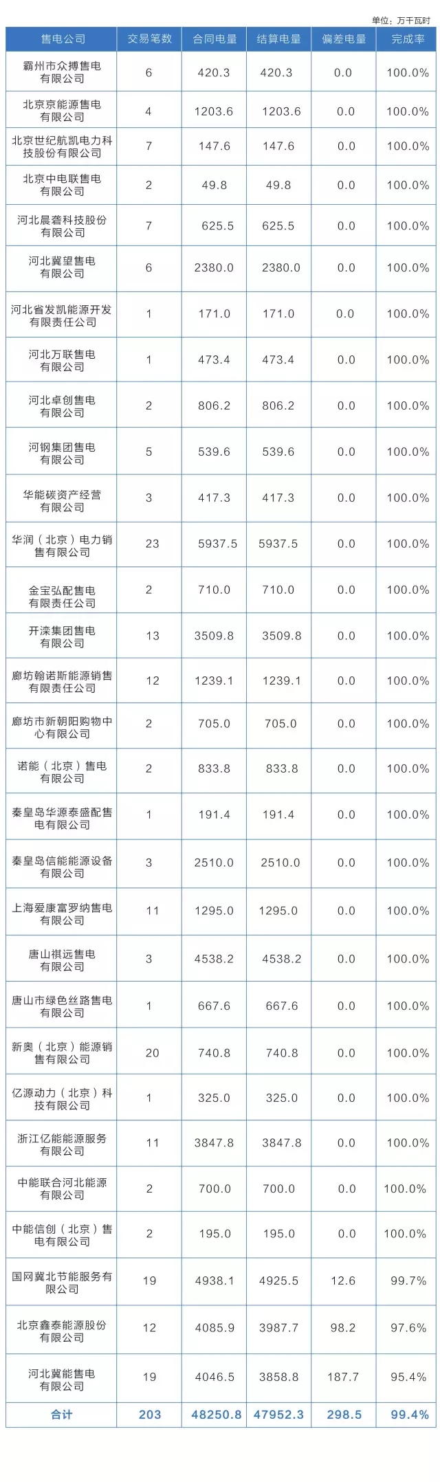 15家冀北統(tǒng)調(diào)電廠參與直接交易,合同電量4.58億千瓦時(shí),實(shí)際結(jié)算電量4.56億千瓦時(shí),完成率約99.5%。