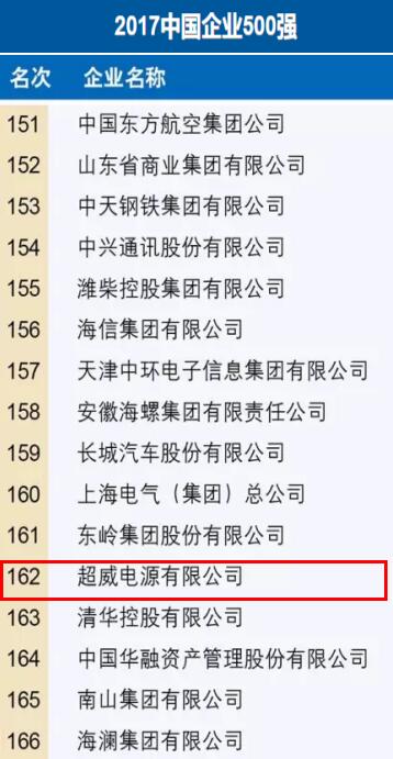 9月9日——9月10日,中國企業(yè)聯(lián)合會、中國企業(yè)家協(xié)會舉辦的2017中國500強企業(yè)高峰論壇在江西南昌舉行。會上,發(fā)布了2017年中國企業(yè)500強、中國制造業(yè)500強、中國服務業(yè)500強三大榜單,超威集團連續(xù)第五年上榜,位列中國企業(yè)500強第162位,中國制造業(yè)500強第67位,排名分別較去年提升24位和18位,繼續(xù)在中國電池企業(yè)中位列第一。