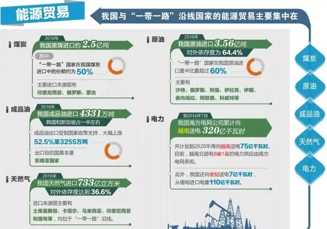 原油貿(mào)易:2016年,我國(guó)原油進(jìn)口3.56億噸,對(duì)外依存度為64.4%?!耙粠б宦贰眹?guó)家在我國(guó)原油進(jìn)口量中比重超過60%,主要有沙特、俄羅斯、阿曼、伊拉克、伊朗、委內(nèi)瑞拉、阿聯(lián)酋、科威特等。