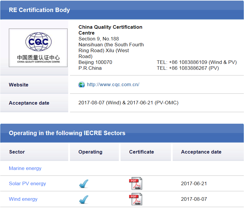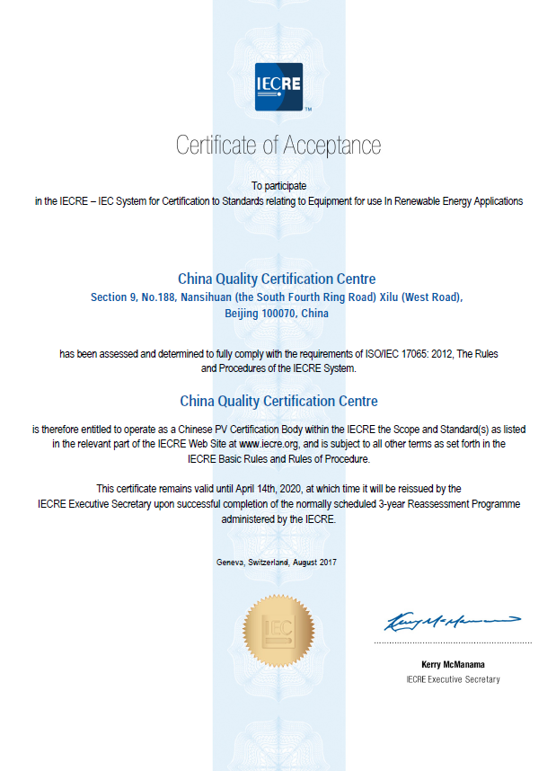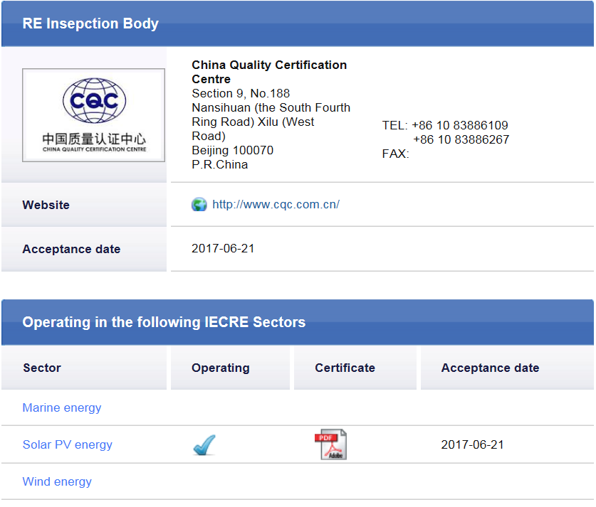中國儲能網(wǎng)訊:繼“領跑者”認證結(jié)果被國家能源局“領跑者”項目、地方政府、扶貧項目和金融機構等多方采信、獲得中國國家標準化管理委員會授權開展光伏產(chǎn)品企業(yè)標準“領跑者”評價后,近日,中國質(zhì)量認證中心(簡稱CQC)再獲國際組織認可,順利取得國際電工委員會可再生能源設備認證互認體系(IECRE)的認證機構和檢驗機構資質(zhì)。