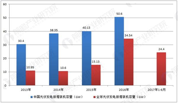 據(jù)前瞻產(chǎn)業(yè)研究院《光伏發(fā)電產(chǎn)業(yè)市場前瞻與投資戰(zhàn)略規(guī)劃分析報告》統(tǒng)計,全球太陽能光伏發(fā)電累計裝機容量由2012年的100.5GW增長到2016年的306.5GW,年均復(fù)合增長率高達32.15%。從全球光伏發(fā)電新增裝機容量來看,中國2016年光伏新增裝機容量為34.54GW,領(lǐng)跑全球光伏市場。
