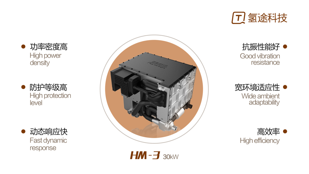 “HM-3氫燃料電池系統(tǒng)防護(hù)性能好,達(dá)到IP67;動(dòng)態(tài)響應(yīng)快,可以達(dá)到30A/S的響應(yīng)速度,滿足車輛的動(dòng)力性需求;抗振性能好,能滿足三個(gè)方向上5個(gè)g的振動(dòng)加速度測(cè)試;環(huán)境適應(yīng)性好,可以在低溫-40℃的環(huán)境下存儲(chǔ),在-10℃的環(huán)境下快速啟動(dòng)。
