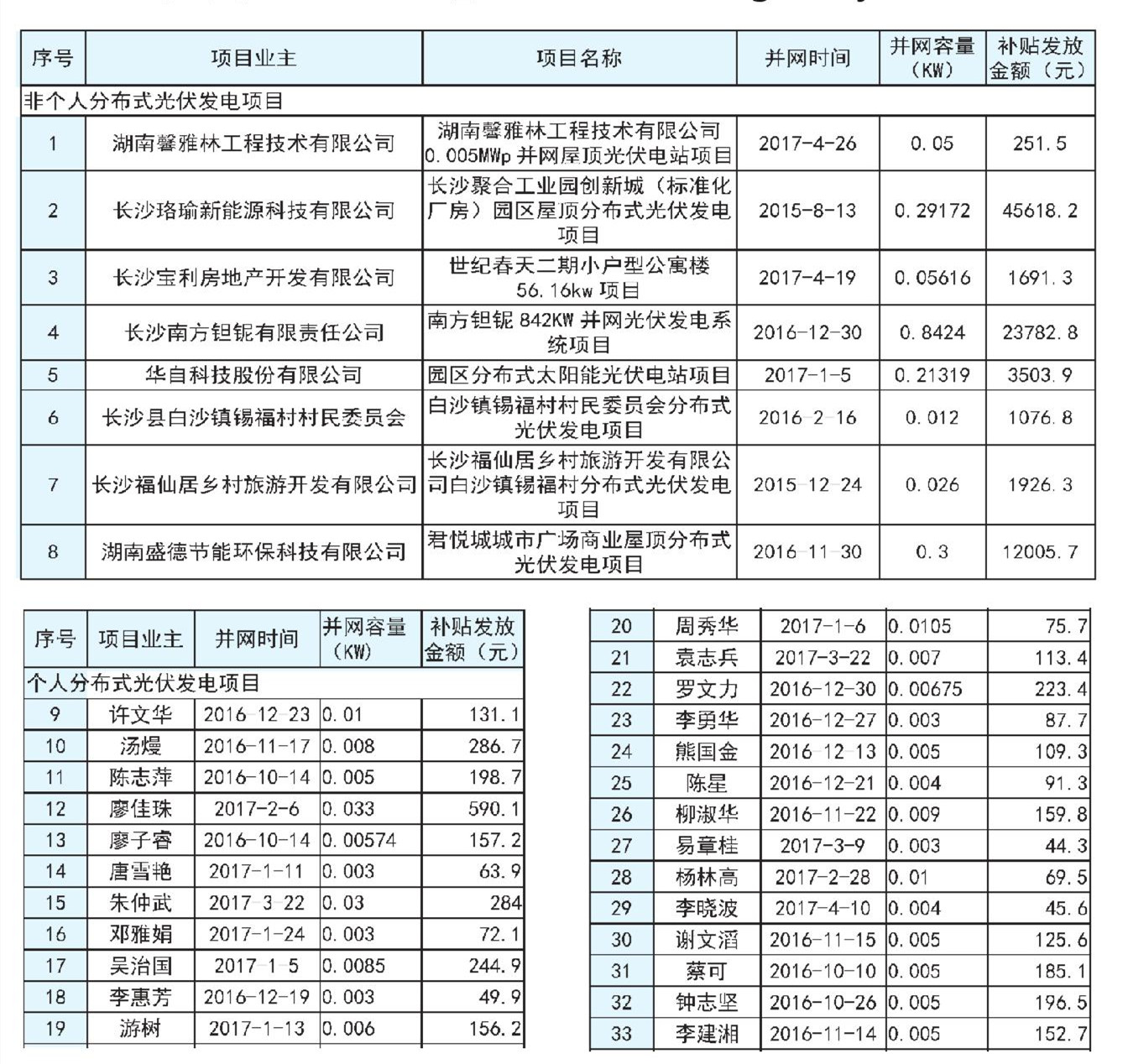 中國(guó)儲(chǔ)能網(wǎng)訊:根據(jù)《長(zhǎng)沙市人民政府辦公廳關(guān)于加快分布式光伏發(fā)電應(yīng)用的實(shí)施意見(jiàn)》(長(zhǎng)政辦發(fā)〔2017〕8號(hào))和長(zhǎng)沙市能源局、長(zhǎng)沙市財(cái)政局《長(zhǎng)沙市分布式光伏發(fā)電補(bǔ)貼方案》(長(zhǎng)能源〔2016〕41號(hào))相關(guān)要求,現(xiàn)將2017上半年度長(zhǎng)沙市分布式光伏發(fā)電擬補(bǔ)貼項(xiàng)目公示如下。如有異議,請(qǐng)?jiān)诠局掌?個(gè)工作日內(nèi)向長(zhǎng)沙市能源局、長(zhǎng)沙市財(cái)政局書面實(shí)名提出。