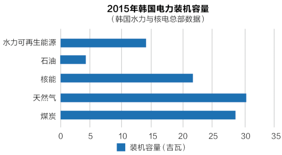2015年底,韓國電力總裝機(jī)容量為98.8GW,其中煤炭28.55GW,天然氣30.4GW,核能21.7GW,石油4.1GW,水力及其他可再生能源14.0GW。核能以22%的裝機(jī)總量在2016年提供了31%的電力。