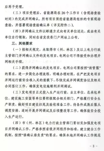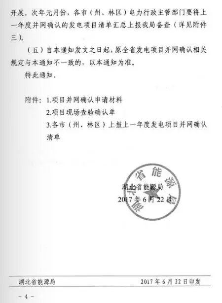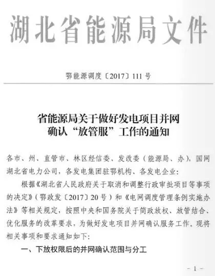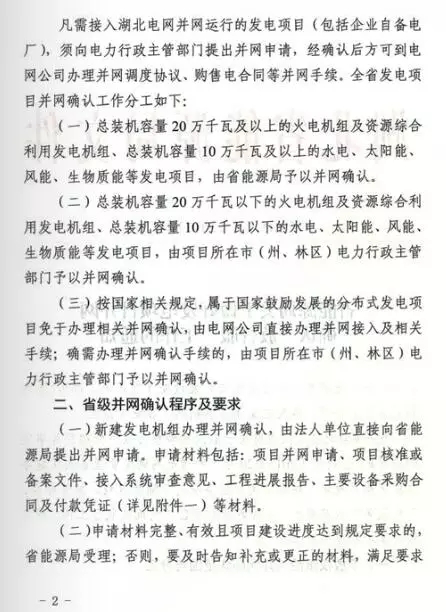 中國儲能網(wǎng)訊:日前,湖北省能源局印發(fā)《關(guān)于做好發(fā)電項目并網(wǎng)確認“放管服”工作的通知》,明確了全省發(fā)電項目并網(wǎng)確認工作分工:(1)總裝機容量20萬千瓦及以上的火電機組及資源綜合利用發(fā)電機組、總裝機容量10萬千瓦及以上的水電、太陽能、風(fēng)能、生物能等發(fā)電項目,由省能源局予以并網(wǎng)確認;(2)總裝機容量20萬千瓦以下的火電機組及資源綜合利用發(fā)電機組、總裝機容量10萬千瓦以下的水電、太陽能、風(fēng)能、生物能等發(fā)電項目,由項目所在市(州、林區(qū))電力行政主管部門予以并網(wǎng)確認;(3)按國家相關(guān)規(guī)定,屬于國家鼓勵發(fā)展的分布式發(fā)電項目免于辦理相關(guān)并網(wǎng)確認,由電網(wǎng)公司直接辦理并網(wǎng)接入及相關(guān)手續(xù);確需辦理并網(wǎng)確認手續(xù)的,由項目所在市(州、林區(qū))電力行政主管部門予以并網(wǎng)確認。