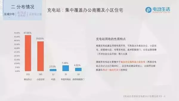 根據(jù)充電站建設(shè)用地的不同性質(zhì),將其分為商業(yè)辦公、小區(qū)住宅、經(jīng)銷商4S店、專營充電站、政府職能部門、公交運(yùn)營保障等六大類,其中公交運(yùn)營保障類的充電站僅限公交系統(tǒng)內(nèi)部使用,不對社會公眾開放,在電動生活探樁調(diào)研團(tuán)隊實際探訪的474個公共充電站中,屬商業(yè)辦公類的223個、小區(qū)住宅類185個、經(jīng)銷商4S店類12個、專營充電站35個、政府職能部門類19個。可以看出,深圳充電站主要集中在商業(yè)辦公場所和小區(qū)住宅,且這兩類充電站合計占比已超86%,從充電站建設(shè)規(guī)劃上看,比較符合新能源車兩點一線的出行特征。