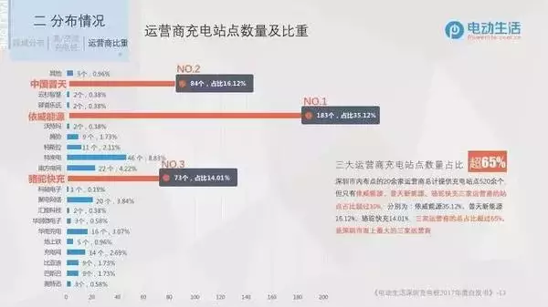 在深圳市內(nèi)布點的20余家運(yùn)營商中,從運(yùn)營商充電站點所占比重來看,依威能源、中國普天、駱駝快充三家運(yùn)營商的站點占比均超10%,且三家運(yùn)營商的總占比超65%;從運(yùn)營商充電樁數(shù)量來看,駱駝快充、中國普天、特來電的電樁數(shù)量占比超過10%,且三家運(yùn)營商的充電樁數(shù)量總占比超過67%。