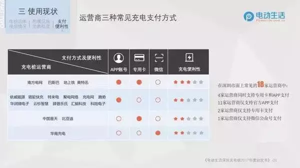 從支付便利性方面來看,在深圳市面上的18家主要運(yùn)營商中:4家同時支持專用卡和APP支付;11家僅支持官方APP支付;2家僅支持專用卡支付; 1家僅支持微信公眾號支付。