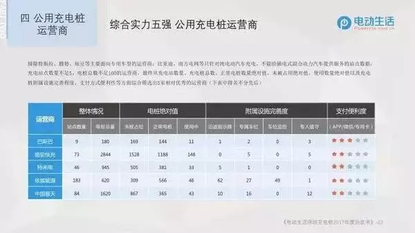 排除特斯拉、騰勢、知豆等主要面向?qū)S密囆偷倪\(yùn)營商;比亞迪、南方電網(wǎng)等只針對純電動汽車充電、不能給插電式混合動力汽車提供服務(wù)的站點數(shù)據(jù);充電站點數(shù)量不足5、電樁總數(shù)不足100的運(yùn)營商,最終從充電站數(shù)量、充電樁總數(shù)、正常電樁數(shù)量絕對值、未被占用絕對值、使用數(shù)量絕對值以及充電樁附屬設(shè)施完善程度、支付方式便利性等方面綜合篩選出5家相對優(yōu)秀的運(yùn)營商(下表中排名不分先后)