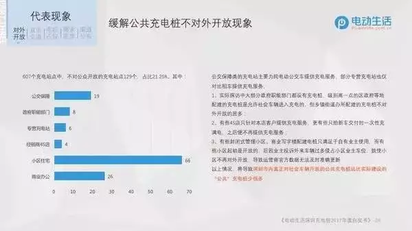電動生活探樁調(diào)研團(tuán)隊走訪的607個充電站點中,不對公眾開放的充電站點129個,占比21.25%。這其中,屬于商業(yè)辦公類的26個、小區(qū)住宅類66個、經(jīng)銷商4S店類4個、專營充電站6個、政府職能部門類8個,公交保障類的19個。