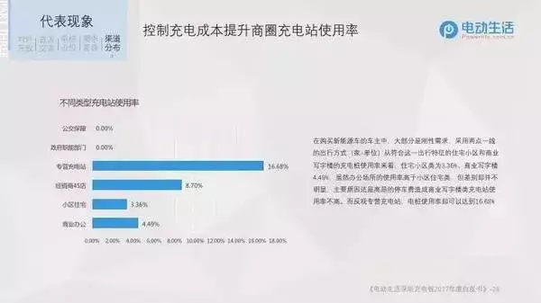 在購買新能源車的車主中,大部分是剛性需求,采用兩點一線的出行方式(家-單位)從符合這一出行特征的住宅小區(qū)和商業(yè)寫字樓的充電樁使用率來看,住宅小區(qū)類為3.36%、商業(yè)寫字樓4.49%,雖然辦公場所的使用率高于小區(qū)住宅類,但差別卻并不明顯,主要原因還是高昂的停車費(fèi)造成商業(yè)寫字樓類充電站使用率不高。