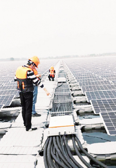 盡管是春天,但當(dāng)日最高氣溫達(dá)到30度,湖面上已安裝好的大片的太陽能電池板盡情地享受著陽光的熱量,一臺臺逆變器、一條條纜線正在將汩汩電流接入?yún)R流器。