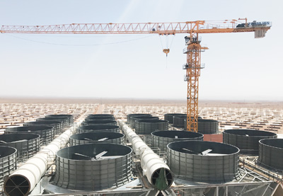 施工現(xiàn)場(chǎng)是1430公頃的荒漠地帶,65萬(wàn)塊光伏鏡面裝置整齊鋪設(shè),巨大的熔鹽罐和集熱塔分布其間。
