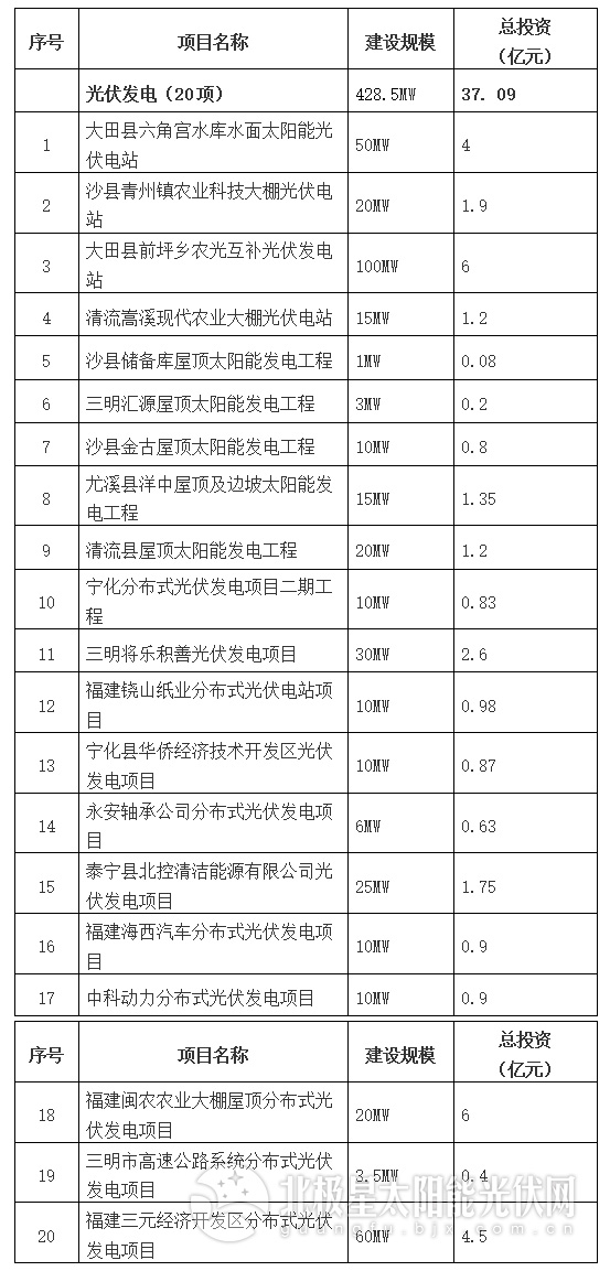 中國儲能網(wǎng)訊:近日,三明市人民政府辦公室關于印發(fā)三明市“十三五”能源發(fā)展專項規(guī)劃的通知,規(guī)劃羅列了能源建設的重點項目共72項,包括核電、光伏發(fā)電、風力發(fā)電、水力發(fā)電、火力發(fā)電、變電站、天然氣、煤礦及電動汽車充換電基礎設施等項目。其中指出,“十三五”期間規(guī)劃光伏發(fā)電項目20個,共428.5MW,計劃總投資37.09億元。