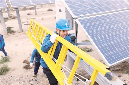中國(guó)儲(chǔ)能網(wǎng)訊:2月17日,國(guó)網(wǎng)山東昌邑市供電公司技術(shù)人員在下營(yíng)鎮(zhèn)濱海100兆瓦“漁光互補(bǔ)”光伏發(fā)電項(xiàng)目現(xiàn)場(chǎng)對(duì)設(shè)備進(jìn)行日?!绑w檢”。據(jù)悉,該項(xiàng)目為山東省最大的單體“漁光互補(bǔ)”光伏發(fā)電項(xiàng)目,自2016年6月并網(wǎng)以來,已累計(jì)發(fā)電9200萬(wàn)千瓦時(shí)。 張志強(qiáng)攝