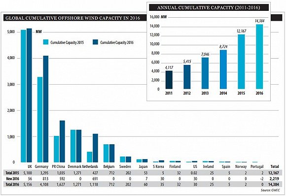 隨著陸地棄風(fēng)日益嚴(yán)重,海上風(fēng)電裝機(jī)卻迎來了“春天”。報告顯示,2016年全球海上風(fēng)電新增裝機(jī)容量2.2GW,累計裝機(jī)容量14.3GW,其中中國海上風(fēng)電新增裝機(jī)量增加了592MW,累計容量達(dá)到1627MW,比2015年增加58%。