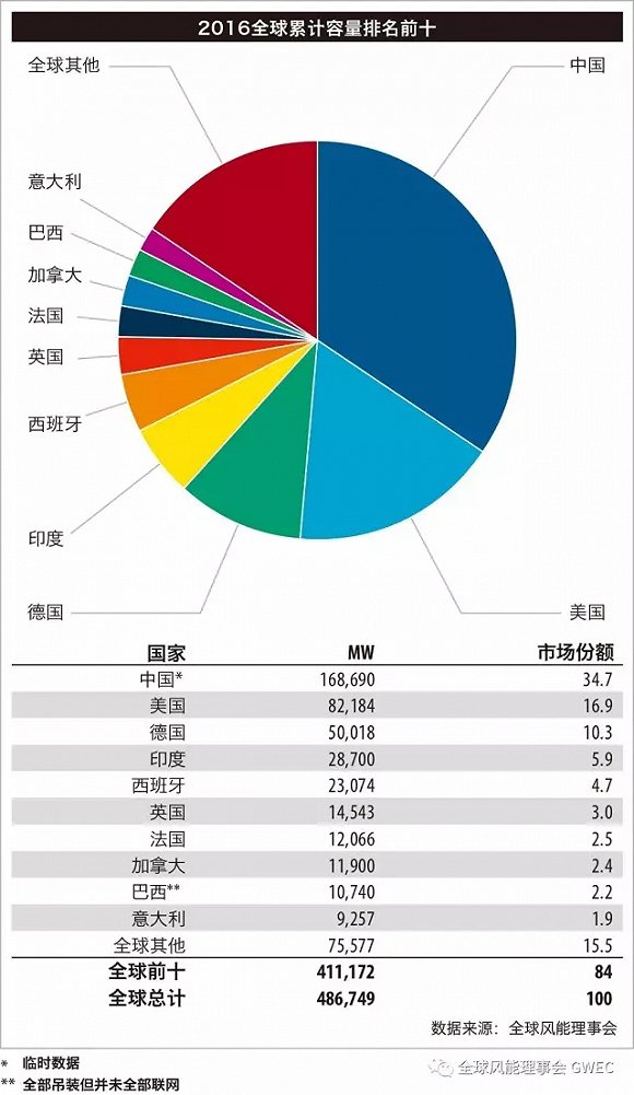 2017年2月10日,全球風(fēng)能理事會(Global Wind Energy Council)在布魯塞爾發(fā)布了《全球風(fēng)電統(tǒng)計數(shù)據(jù)2016》。報告顯示,2016年全球市場新增容量超過54.6GW,累計容量達(dá)到486.7GW。其中,中國新增裝機(jī)容量23.3GW,累計裝機(jī)容量168.7GW,分別占世界份額的42.7%和34.7%。