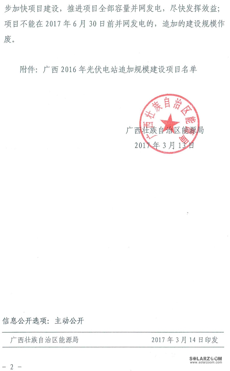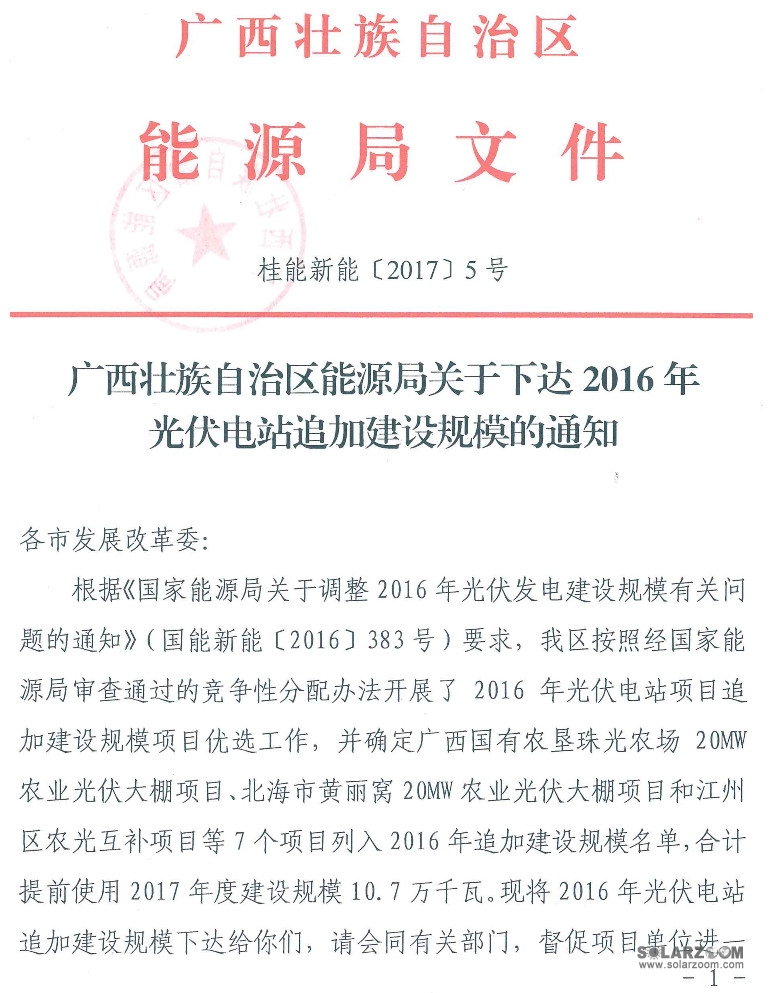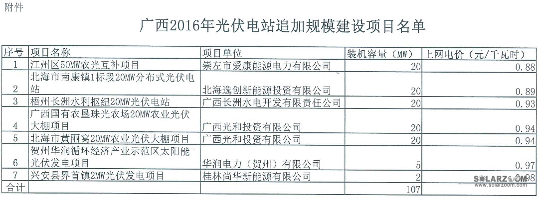 中國儲能網訊:近日,廣西能源局下達《2016年光伏電站追加規(guī)模的通知》?!锻ㄖ分赋龃舜螐V西共有7個項目列入2016年 追加建設規(guī)模名單,合計提前使用2017年度建設規(guī)模107MW。項目不能在2017年6月30日前并網發(fā)電的,追加的建設規(guī)模作廢。