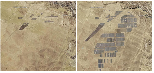 左:龍羊峽光伏電站2013年空拍。右:2017年空拍。(來(lái)源:NASA)