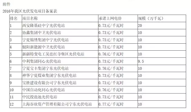 按照《自治區(qū)人民政府辦公廳關于印發(fā)光伏園區(qū)電站項目資源配置指導意見和光伏電站項目備案和建設管理辦法的通知》、《自治區(qū)發(fā)展改革委關于印發(fā)2016年我區(qū)光伏電站項目競爭性配置試行辦法的通知》,我委將對12家簽訂《光伏電站配套產業(yè)項目推進合作協(xié)議》企業(yè)的光伏電站項目辦理備案手續(xù)?,F(xiàn)將2016年度我區(qū)光伏發(fā)電項目備案情況公告如下: