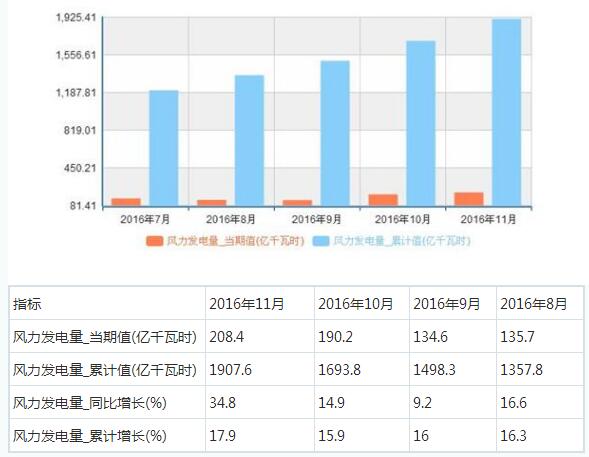 中國儲能網訊:2016年11月我國當月風力發(fā)電量208.4億千瓦時,累計發(fā)電量1907.6億千瓦時,同比增長34.8%,累計增長17.9%。