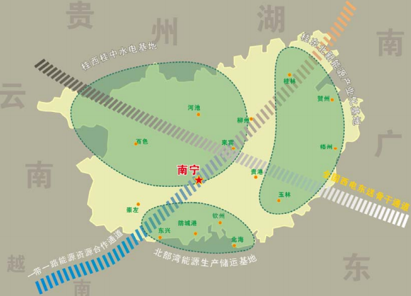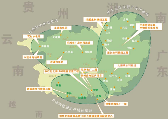 (二)“三基地”。即建設(shè)北部灣能源生產(chǎn)儲運(yùn)基地、桂東北新能源產(chǎn)業(yè)化基地、桂西桂中水電基地。