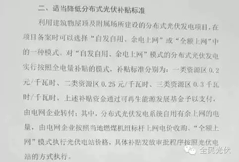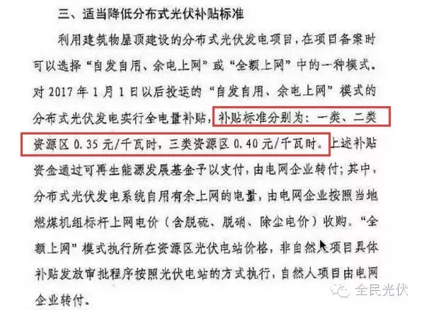 該文件與上一版本的征求意見稿不同的是,分布式光伏的補貼標準由之前的“一類資源區(qū)0.2元/千瓦時、二類資源區(qū)0.25元/千瓦時、三類資源區(qū)0.3元/千瓦時”調(diào)整為“一類、二類資源區(qū)0.35元/千瓦時,三類資源區(qū)0.40元/千瓦時”。