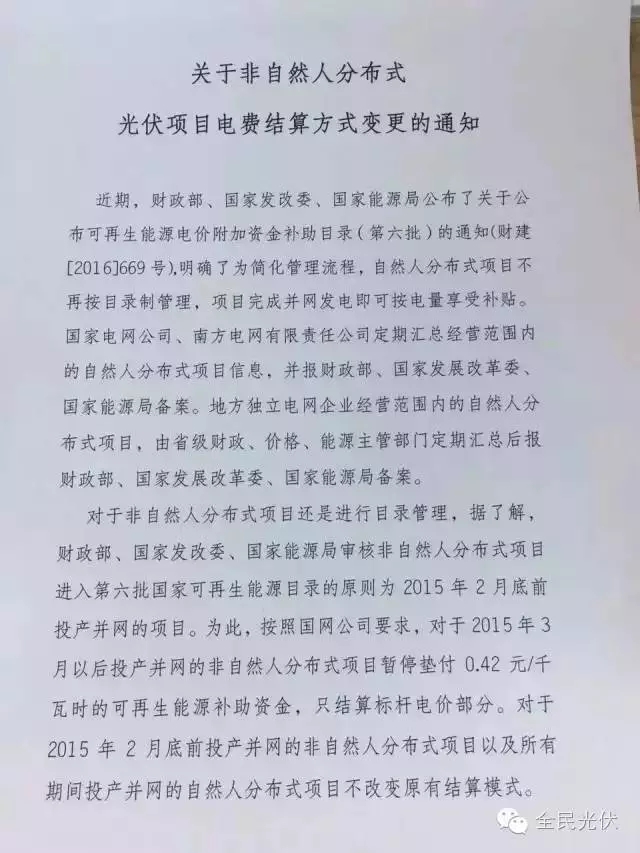 該條通知要求,對于2015年3月份以后投產(chǎn)并網(wǎng)的非自然人分布式項目暫停墊付0.42元/千瓦時的可再生能源補貼資金。雖然這條信息并未證實其真實性,但也表現(xiàn)出了國網(wǎng)的一種擔憂和態(tài)度,財政局大量拖欠可再生能源補貼,這嚴重影響國網(wǎng)的資金狀況和財務(wù)狀況,國網(wǎng)也沒有義務(wù)墊付光伏補貼。
