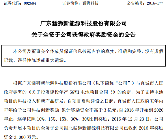 公告稱,根據(jù)《企業(yè)會計準則》的相關(guān)規(guī)定,上述3,000萬元獎勵資金將計入湖北猛獅新能源科技有限公司2016年營業(yè)外收入,全部確認為當期損益,最終會計處理以注冊會計師在年度審計確認后的結(jié)果為準。上述獎勵資金的取得將對公司2016年度的經(jīng)營業(yè)績產(chǎn)生積極影響。